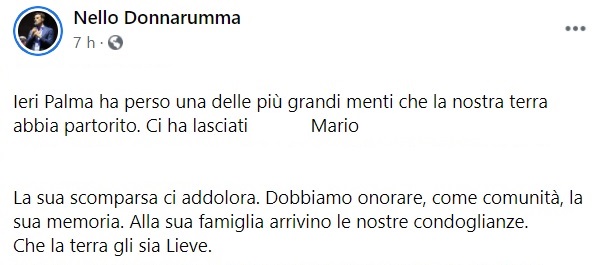 Questo il messaggio di cordoglio che apprendiamo dalla pagina facebook del Sindaco di Palma Campania: "Ieri Palma ha perso una delle più grandi menti che la nostra terra abbia partorito. Ci ha lasciati ... Mario ... La sua scomparsa ci addolora. Dobbiamo onorare, come comunità, la sua memoria. Alla sua famiglia arrivino le nostre condoglianze. Che la terra gli sia Lieve."