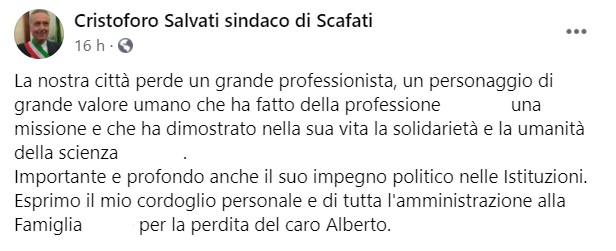 "La nostra città perde un grande professionista, un personaggio di grande valore umano che ha fatto della professione ... una missione e che ha dimostrato nella sua vita la solidarietà e la umanità della scienza ... -Si legge nella nota- Importante e profondo anche il suo impegno politico nelle Istituzioni. Esprimo il mio cordoglio personale e di tutta l'amministrazione alla Famiglia ... per la perdita del caro Alberto."