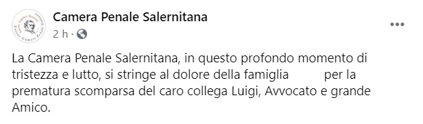 "La Camera Penale Salernitana, in questo profondo momento di tristezza e lutto, si stringe al dolore della famiglia ... -si legge nella nota- per la prematura scomparsa del caro collega Luigi, Avvocato e grande Amico."