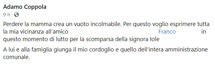 "Perdere la mamma crea un vuoto incolmabile. Per questo voglio esprimere tutta la mia vicinanza all’amico ... Franco ... , -si legge nella nota- in questo momento di lutto per la scomparsa della signora Iole ... A lui e alla famiglia giunga il mio cordoglio e quello dell’intera amministrazione comunale."