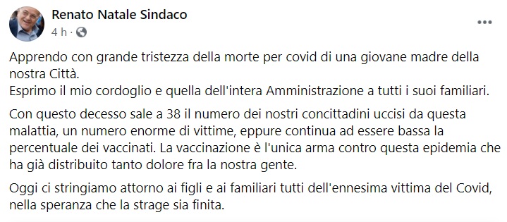 Questo il messaggio di cordoglio che apprendiamo dalla pagina facebook del Sindaco di Casal di Principe Natale: "Apprendo con grande tristezza della morte per covid di una giovane madre della nostra Città. Esprimo il mio cordoglio e quella dell'intera Amministrazione a tutti i suoi familiari. Con questo decesso sale a 38 il numero dei nostri concittadini uccisi da questa malattia, un numero enorme di vittime, eppure continua ad essere bassa la percentuale dei vaccinati. La vaccinazione è l'unica arma contro questa epidemia che ha già distribuito tanto dolore fra la nostra gente. Oggi ci stringiamo attorno ai figli e ai familiari tutti dell'ennesima vittima del Covid, nella speranza che la strage sia finita."