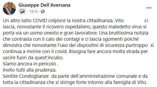 Questo il messaggio di cordoglio che apprendiamo dal Sindaco Giuseppe Dell'Aversana di S.Arpino: "Un altro lutto COVID colpisce la nostra cittadinanza. Vito ... ci lascia, nonostante il ricovero ospedaliero, questo maledetto virus si porta via un uomo onesto - si legge nella nota - e gran lavoratore. Una bruttissima notizia che contrasta con il calo dei contagi e ci lascia sgomenti poiché dimostra che nonostante l’uso dei dispositivi di sicurezza purtroppo si continua a morire con il covid. Bisogna fare ancora molta strada per uscire fuori da quest’incubo. Siamo ancora in pericolo. Invito tutti alla prudenza. Sentite Condoglianze da parte dell’amministrazione comunale e da tutta la cittadinanza - si legge nella nota - che si stringe forte intorno alla famiglia di Vito."