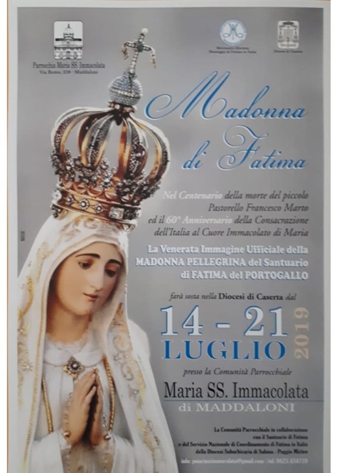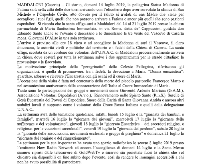 Di seguito, il testo del comunicato sull'effige pellegrina della Madonna di Fatima a Maddaloni, giunto in redazione.