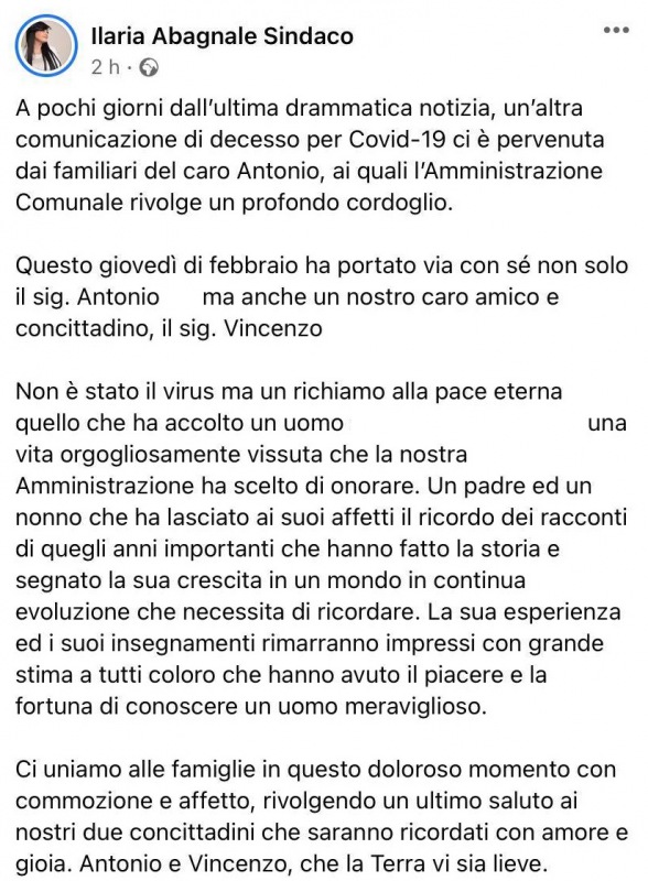 Questo il messaggio di cordoglio che apprendiamo dalla pagina Facebook del sindaco di S.Antonio Abate: "A pochi giorni dall’ultima drammatica notizia, un’altra comunicazione di decesso per Covid-19 ci è pervenuta dai familiari del caro Antonio - si legge nella nota -, ai quali l’Amministrazione Comunale rivolge un profondo cordoglio. Questo giovedì di febbraio ha portato via con sé non solo il sig. Antonio ... ma anche un nostro caro amico e concittadino, il sig. Vincenzo ... Non è stato il virus ma un richiamo alla pace eterna quello che ha accolto un uomo ..., una vita orgogliosamente vissuta che la nostra Amministrazione ha scelto di onorare. Un padre ed un nonno che ha lasciato ai suoi affetti il ricordo dei racconti - si legge nella nota - di quegli anni importanti che hanno fatto la storia e segnato la sua crescita in un mondo in continua evoluzione che necessita di ricordare. La sua esperienza ed i suoi insegnamenti rimarranno impressi con grande stima a tutti coloro che hanno avuto il piacere e la fortuna di conoscere un uomo meraviglioso. Ci uniamo alle famiglie - si legge nella nota - in questo doloroso momento con commozione e affetto, rivolgendo un ultimo saluto ai nostri due concittadini che saranno ricordati con amore e gioia. Antonio e Vincenzo, che la Terra vi sia lieve."