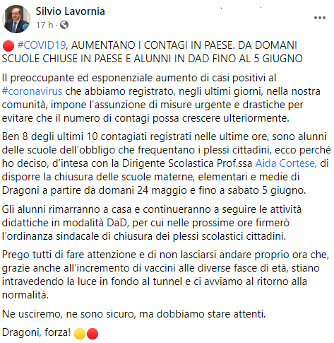 Questo il post pubblicato ieri sera sulla sua pagina Facebook dal Sindaco di Dragoni Silvio Lavornia: "Covid-19. Aumentano i contagi in paese. Da domani scuole chiuse in paese e alunnni in dad fino al 5 giugno. Il preoccupante ed esponenziale aumento di casi positivi al cronavirus - si legge nel post - che abbiamo registrato, negli ultimi giorni, nella nostra comunità, impone l’assunzione di misure urgente e drastiche per evitare che il numero di contagi possa crescere ulteriormente. Ben 8 degli ultimi 10 contagiati registrati nelle ultime ore - prosegue il post - sono alunni delle scuole dell’obbligo che frequentano i plessi cittadini, ecco perché ho deciso, d’intesa con la Dirigente Scolastica Prof.ssa Aida Cortese, di disporre la chiusura delle scuole materne, elementari e medie di Dragoni a partire da domani 24 maggio e fino a sabato 5 giugno. Gli alunni - prosegue il post - rimarranno a casa e continueranno a seguire le attività didattiche in modalità DaD, per cui nelle prossime ore firmerò l’ordinanza sindacale di chiusura dei plessi scolastici cittadini. Prego tutti di fare attenzione e di non lasciarsi andare proprio ora che, grazie anche all’incremento di vaccini - si legge ancora nel post - alle diverse fasce di età, stiano intravedendo la luce in fondo al tunnel e ci avviamo al ritorno alla normalità. Ne usciremo, ne sono sicuro, ma dobbiamo stare attenti. Dragoni, forza!".