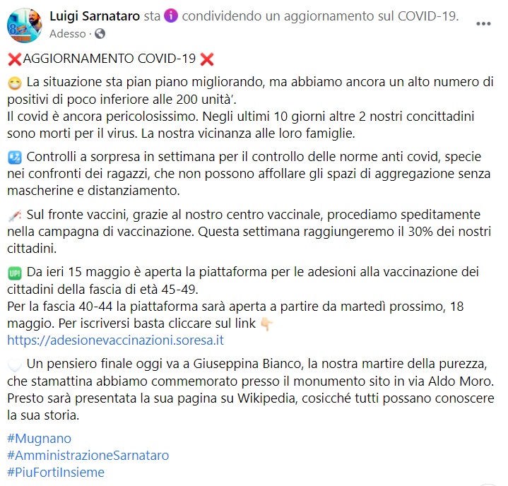 "AGGIORNAMENTO COVID-19. La situazione sta pian piano migliorando, ma abbiamo ancora un alto numero di positivi di poco inferiore alle 200 unità’. Il covid è ancora pericolosissimo. Negli ultimi 10 giorni altre 2 nostri concittadini sono morti per il virus. La nostra vicinanza- si legge nella nota- alle loro famiglie. Controlli a sorpresa in settimana per il controllo delle norme anti covid, specie nei confronti dei ragazzi, che non possono affollare gli spazi di aggregazione senza mascherine e distanziamento. Sul fronte vaccini, grazie al nostro centro vaccinale, procediamo speditamente nella campagna di vaccinazione. Questa settimana raggiungeremo il 30% dei nostri cittadini. Da ieri 15 maggio è aperta la piattaforma per le adesioni alla vaccinazione dei cittadini della fascia di età 45-49. Per la fascia 40-44 la piattaforma sarà aperta a partire da martedì prossimo, 18 maggio. Per iscriversi basta cliccare sul link https://adesionevaccinazioni.soresa.it. Un pensiero finale oggi va a Giuseppina Bianco, la nostra martire della purezza, che stamattina abbiamo commemorato presso il monumento sito in via Aldo Moro. Presto- si legge nella nota- sarà presentata la sua pagina su Wikipedia, cosicché tutti possano conoscere la sua storia."