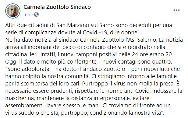"Altri due cittadini di San Marzano sul Sarno sono deceduti per una serie di complicanze dovute al Covid -19, due donne ... Ne ha dato notizia al sindaco Carmela Zuottolo l’Asl Salerno. La notizia arriva all’indomani del picco di contagio che si è registrato nella cittadina. -Si legge nella nota- Ieri, infatti, i nuovi tamponi positivi nelle 24 ore erano 20. Oggi il dato è molto più confortante, i nuovi contagi sono quattro. “Sono addolorata – ha detto il sindaco Zuottolo – per i nuovi lutti che hanno colpito la nostra comunità. Ci stringiamo intorno alle famiglie per la scomparsa dei loro cari. -Si legge nella nota- Purtroppo il virus non molla la presa. È necessario essere prudenti, rispettare le norme anti Covid, indossare la mascherina, mantenere la distanza interpersonale, evitare assembramenti, lavare spesso le mani. Ci troviamo di fronte ad un virus subdolo che sta, purtroppo, condizionando la nostra vita”.