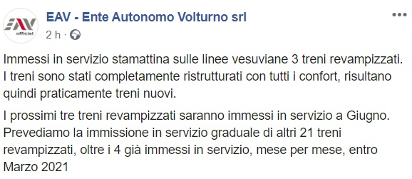 Questo quanto apprendiamo dalla apgina facebook dell'EAV: