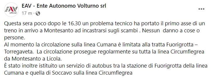 Questo quanto pubblicato sulla pagina facebook dell'EAV: