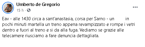 "Eav - alle 1430 circa a sant’anastasia, corsa per Sarno - un ...in pochi minuti martella un treno appena revampizzato e rompe i vetri dentro e fuori al treno e si da alla fuga. Vediamo se grazie alle telecamere riusciamo a fare denuncia dettagliata."