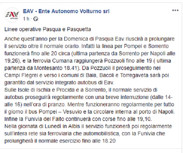 Questo il post pubblicato sulla pagina fb ufficiale dell'Eav.