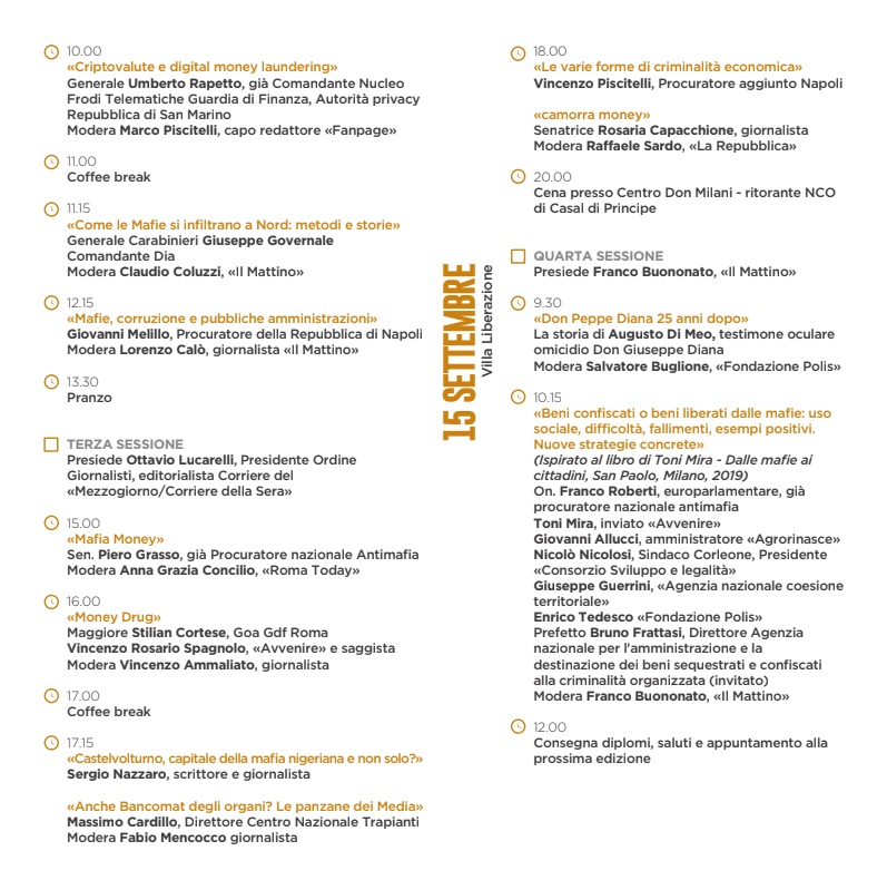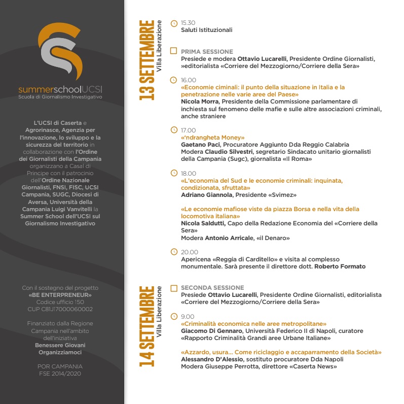 "Parte da Casal di Principe (Caserta), territorio impegnato in prima linea nella lotta alla criminalità organizzata, il grido di allarme sul fenomeno dell’economia criminale, sull’evoluzione delle organizzazioni mafiose e sulle criptovalute. Una sfida ambiziosa lanciata dalla Summer School Ucsi, la scuola di giornalismo investigativo promossa dall’Unione cattolica stampa italiana di Caserta e dall’Agenzia pubblica per la legalità Agrorinasce, in collaborazione con l’Ordine dei giornalisti Campania. La quinta edizione, intitolata “Our Bisinissi – Criminal Economies / Gli Affari Nostri – Economie Criminali”, è in programma dal 13 al 15 settembre a Villa Liberazione (in via Angiolieri), già nota come “Villa Scarface”, bene confiscato al fratello del capoclan dei Casalesi, Walter Schiavone, attualmente in gestione all’ASL Caserta che ha realizzato un Centro diurno per la salute mentale".