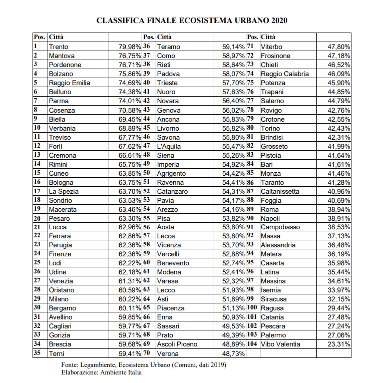 La classifica finale Ecosistema Urbano 2020 stilata da Legambinete, inerente alle Province, vede ai primi posti Trento, Mantova e Pordenone. Tra le Campane spicca Avellino al 31 esimo posto, seguito da Benevento al 60esimo, Salerno al 77esimo, Napoli al 90esimo e Caserta al 95esimo. Questa la classifica finale Ecosistema Urbano 2020 dal sito di Legambiente: