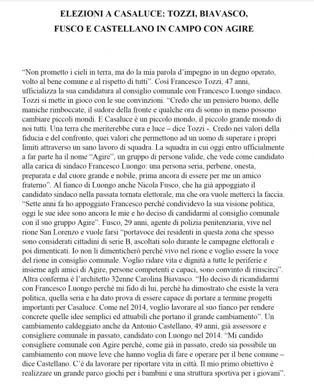 "ELEZIONI A CASALUCE: TOZZI, BIAVASCO, FUSCO E CASTELLANO IN CAMPO CON AGIRE. “Non prometto i cieli in terra, ma do la mia parola d’impegno in un degno operato, volto al bene comune e al rispetto di tutti”. Così Francesco Tozzi, 47 anni, ufficializza la sua candidatura al consiglio comunale con Francesco Luongo sindaco. Tozzi si mette in gioco con le sue convinzioni. “Credo che un pensiero buono, delle maniche rimboccate, il sudore della fronte e qualche ora di sonno in meno possono cambiare- si legge nella nota- piccoli mondi. E Casaluce è un piccolo mondo, il piccolo grande mondo di noi tutti. Una terra che meriterebbe cura e luce – dice Tozzi -. Credo nei valori della fiducia e del confronto, quei valori che permettono ad un uomo di superare i propri limiti attraverso un sano lavoro di squadra. La squadra in cui oggi entro ufficialmente a far parte ha il nome “Agire”, un gruppo di persone valide, che vede come candidato alla carica di sindaco Francesco Luongo: una persona seria, perbene, onesta, preparata e dal cuore grande e nobile, prima ancora di essere per me un amico fraterno”. Al fianco di Luongo anche Nicola Fusco, che ha già appoggiato il candidato sindaco nella passata tornata elettorale, ma che ora vuole metterci la faccia. “Sette anni fa ho appoggiato Francesco perché condividevo la sua visione politica, oggi le sue idee sono ancora le mie e ho deciso di candidarmi al consiglio comunale con il suo gruppo Agire”. Fusco, 29 anni, agente di polizia penitenziaria, vive nel rione San Lorenzo e vuole farsi “portavoce dei residenti in questa zona che- si legge nella nota- spesso sono considerati cittadini di serie B, ascoltati solo durante le campagne elettorali e poi dimenticati. Io non li dimenticherò perché vivo nel rione e voglio essere la voce del rione in consiglio comunale. Voglio ridare vita e dignità a tutte le periferie e insieme agli amici di Agire, persone competenti e capaci, sono convinto di riuscirci”. Altra conferma è l’architetto 32enne Carolina Biavasco. “Ho deciso di ricandidarmi con Francesco Luongo perché mi fido di lui, perché ha dimostrato che esiste la vera politica, quella seria e ha dato prova di essere capace di portare a termine progetti importanti per Casaluce. Come nel 2014, voglio lavorare al suo fianco per rendere concrete quelle idee semplici ed attuabili che portano il grande cambiamento”. Un cambiamento caldeggiato anche da Antonio Castellano, 49 anni, già assessore e consigliere comunale in passato, candidato con Luongo nel 2014. “Mi candido consigliere comunale con Agire perché, come già in passato, credo sia possibile un cambiamento con nuove leve che hanno voglia di fare e operare per il bene comune – dice Castellano. C’è da lavorare- si legge nella nota- per riportare vita in città. Il mio primo obiettivo è realizzare un grande parco giochi per i bambini e una struttura sportiva per i giovani”."