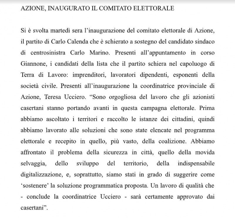 "AZIONE, INAUGURATO IL COMITATO ELETTORALE. Si è svolta martedì sera l’inaugurazione del comitato elettorale di Azione, il partito di Carlo Calenda che è schierato a sostegno del candidato sindaco di centrosinistra Carlo Marino. Presenti- si legge nella nota- all’appuntamento in corso Giannone, i candidati della lista che il partito schiera nel capoluogo di Terra di Lavoro: imprenditori, lavoratori dipendenti, esponenti della società civile. Presenti all’inaugurazione la coordinatrice provinciale di Azione, Teresa Ucciero. “Sono orgogliosa del lavoro che gli azionisti casertani stanno portando avanti in questa campagna elettorale. Prima abbiamo ascoltato i territori e raccolto le istanze dei cittadini, quindi abbiamo lavorato alle soluzioni che sono state elencate nel programma elettorale e recepito in quello, più vasto, della coalizione. Abbiamo affrontato il problema della sicurezza in città, quello della movida selvaggia, dello sviluppo del territorio, della indispensabile digitalizzazione, e, soprattutto, siamo stati in grado di suggerire come ‘sostenere’- si legge nella nota- la soluzione programmatica proposta. Un lavoro di qualità che - conclude la coordinatrice Ucciero - sarà certamente approvato dai casertani”."