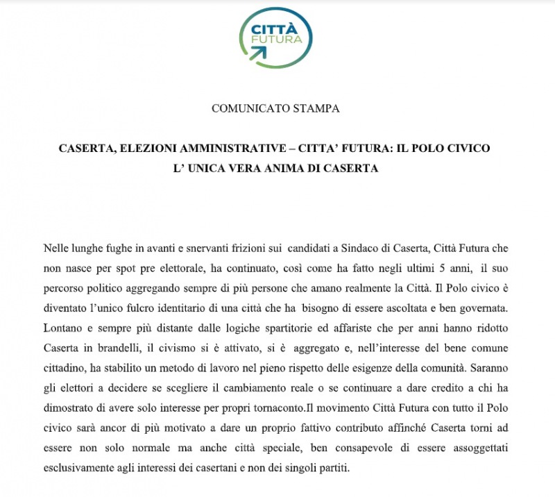 "ELEZIONI AMMINISTRATIVE – CITTA’ FUTURA: IL POLO CIVICO L’ UNICA VERA ANIMA DI CASERTA. Nelle lunghe fughe in avanti e snervanti frizioni sui candidati a Sindaco di Caserta, Città Futura che non nasce per spot pre elettorale, ha continuato, così come ha fatto negli ultimi 5 anni, il suo percorso politico aggregando sempre di più persone che amano realmente la Città. Il Polo civico è diventato l’unico fulcro identitario di una città che ha bisogno- si legge nella nota- di essere ascoltata e ben governata. Lontano e sempre più distante dalle logiche spartitorie ed affariste che per anni hanno ridotto Caserta in brandelli, il civismo si è attivato, si è aggregato e, nell’interesse del bene comune cittadino, ha stabilito un metodo di lavoro nel pieno rispetto delle esigenze della comunità. Saranno gli elettori a decidere se scegliere il cambiamento reale o se continuare a dare credito a chi ha dimostrato di avere solo interesse per propri tornaconto. Il movimento Città Futura con tutto il Polo civico sarà ancor di più motivato a dare un proprio fattivo contributo affinché Caserta torni ad essere non solo normale ma anche città speciale, ben consapevole- si legge nella nota- di essere assoggettati esclusivamente agli interessi dei casertani e non dei singoli partiti."