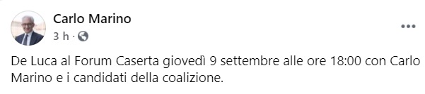 Questo quanto apprendiamo dalla pagina fb del Sindaco Carlo Marino: "De Luca al Forum Caserta giovedì 9 settembre alle ore 18:00 con Carlo Marino e i candidati della coalizione."