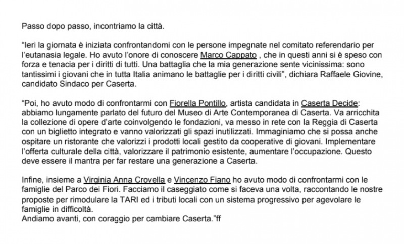 "Passo dopo passo, incontriamo la città. “Ieri la giornata è iniziata confrontandomi con le persone impegnate nel comitato referendario per l’eutanasia legale. Ho avuto l’onore di conoscere Marco Cappato , che in questi anni si è speso con forza e tenacia per i diritti di tutti. Una battaglia- si legge nella nota- che la mia generazione sente vicinissima: sono tantissimi i giovani che in tutta Italia animano le battaglie per i diritti civili”, dichiara Raffaele Giovine, candidato Sindaco per Caserta. “Poi, ho avuto modo di confrontarmi con Fiorella Pontillo, artista candidata in Caserta Decide: abbiamo lungamente parlato del futuro del Museo di Arte Contemporanea di Caserta. Va arricchita la collezione di opere d’arte coinvolgendo le fondazioni, va messo in rete con la Reggia di Caserta con un biglietto integrato e vanno valorizzati gli spazi inutilizzati. Immaginiamo che si possa anche ospitare un ristorante che valorizzi i prodotti locali gestito da cooperative di giovani. Implementare l’offerta culturale della città, valorizzare il patrimonio esistente, aumentare l’occupazione. Questo deve essere il mantra per far restare una generazione a Caserta. Infine, insieme a Virginia Anna Crovella e Vincenzo Fiano ho avuto modo di confrontarmi- si legge nella nota- con le famiglie del Parco dei Fiori. Facciamo il caseggiato come si faceva una volta, raccontando le nostre proposte per rimodulare la TARI ed i tributi locali con un sistema progressivo per agevolare le famiglie in difficoltà. Andiamo avanti, con coraggio per cambiare Caserta.”