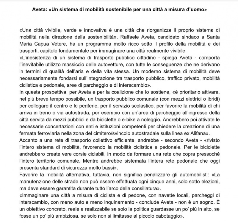 "Aveta: «Un sistema di mobilità sostenibile per una città a misura d’uomo». «Una città vivibile, verde e innovativa è una città che riorganizza il proprio sistema di mobilità nella direzione della sostenibilità». Raffaele Aveta, candidato sindaco a Santa Maria Capua Vetere, ha un programma- si legge nella nota- molto ricco sotto il profilo della mobilità e dei trasporti, capitolo fondamentale per immaginare una città realmente vivibile. «L’inesistenza di un sistema di trasporto pubblico cittadino - spiega Aveta - comporta l’inevitabile utilizzo massiccio delle autovetture, con tutte le conseguenze che ne derivano in termini di qualità dell’aria e della vita stessa. Un moderno sistema di mobilità deve necessariamente fondarsi sull’integrazione tra trasporto pubblico, traffico privato, mobilità ciclistica e pedonale, aree di parcheggio e di interscambio». In questa prospettiva, per Aveta e per la coalizione che lo sostiene, «è prioritario attivare, nel più breve tempo possibile, un trasporto pubblico comunale (con mezzi elettrici o ibridi) per collegare il centro e le periferie, per il servizio scolastico, per favorire- si legge nella nota- la mobilità di chi arriva in treno o via autostrada, per esempio con un’area di parcheggio all’ingresso della città servita da mezzi pubblici e da biciclette o e-bike a noleggio. Andrebbero poi attivate le necessarie concertazioni con enti e istituzioni competenti per chiedere la creazione di una fermata ferroviaria nella zona del cimitero/svincolo autostradale sulla linea ex Alifana». Accanto a una rete di trasporto collettivo efficiente, andrebbe - secondo Aveta - «rivisto l’intero sistema di mobilità, favorendo la mobilità ciclistica e pedonale. Per le biciclette andrebbero create vere corsie ciclabili, in modo da formare una rete che copra pressoché l’intero territorio comunale. Mentre andrebbe sistemata l’intera rete pedonale che oggi presenta standard di sicurezza molto bassi». Favorire la mobilità alternativa, tuttavia, non significa penalizzare gli automobilisti: «La manutenzione delle strade non può essere effettuata ogni cinque anni, solo sotto elezioni, ma deve essere garantita durante tutto l’arco della consiliatura». «Immaginare una città a misura di ciclista e di pedone, con navette locali, parcheggi di interscambio, con meno auto e meno inquinamento - conclude Aveta - non è un sogno. È- si legge nella nota- un obiettivo concreto, reale e realizzabile se solo la politica guardasse un po’ più in alto, se fosse un po’ più ambiziosa, se solo non si limitasse al piccolo cabotaggio»."