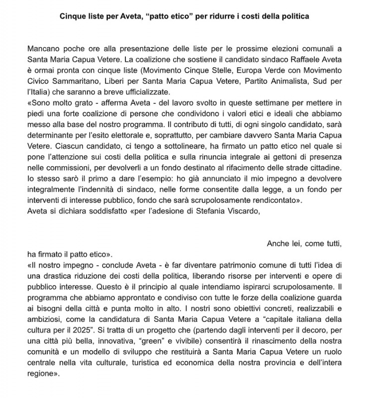 "Cinque liste per Aveta, “patto etico” per ridurre i costi della politica. Mancano poche ore alla presentazione delle liste per le prossime elezioni comunali a Santa Maria Capua Vetere. La coalizione che sostiene il candidato sindaco Raffaele Aveta è ormai pronta con cinque liste (Movimento Cinque Stelle, Europa Verde con Movimento Civico Sammaritano, Liberi per Santa Maria Capua Vetere, Partito Animalista, Sud per l’Italia) che- si legge nella nota- saranno a breve ufficializzate. «Sono molto grato - afferma Aveta - del lavoro svolto in queste settimane per mettere in piedi una forte coalizione di persone che condividono i valori etici e ideali che abbiamo messo alla base del nostro programma. Il contributo di tutti, di ogni singolo candidato, sarà determinante per l’esito elettorale e, soprattutto, per cambiare davvero Santa Maria Capua Vetere. Ciascun candidato, ci tengo a sottolineare, ha firmato un patto etico nel quale si pone l’attenzione sui costi della politica e sulla rinuncia integrale ai gettoni di presenza nelle commissioni, per devolverli a un fondo destinato al rifacimento delle strade cittadine. Io stesso sarò il primo a dare l’esempio: ho già annunciato il mio impegno a devolvere integralmente l’indennità di sindaco, nelle forme consentite dalla legge, a un fondo per interventi di interesse pubblico, fondo che sarà scrupolosamente rendicontato». Aveta si dichiara soddisfatto «per l’adesione di Stefania Viscardo, ... Anche lei, come tutti, ha firmato il patto etico». «Il nostro impegno - conclude Aveta - è far diventare patrimonio comune di tutti l’idea di una drastica riduzione dei costi della politica, liberando risorse per interventi e opere di pubblico interesse. Questo è il principio al quale intendiamo ispirarci scrupolosamente. Il programma che abbiamo approntato e condiviso con tutte le forze della coalizione guarda ai bisogni della città e punta molto in alto. I nostri- si legge nella nota- sono obiettivi concreti, realizzabili e ambiziosi, come la candidatura di Santa Maria Capua Vetere a “capitale italiana della cultura per il 2025”. Si tratta di un progetto che (partendo dagli interventi per il decoro, per una città più bella, innovativa, “green” e vivibile) consentirà il rinascimento della nostra comunità e un modello di sviluppo che restituirà a Santa Maria Capua Vetere un ruolo centrale nella vita culturale, turistica ed economica della nostra provincia e dell’intera regione»."