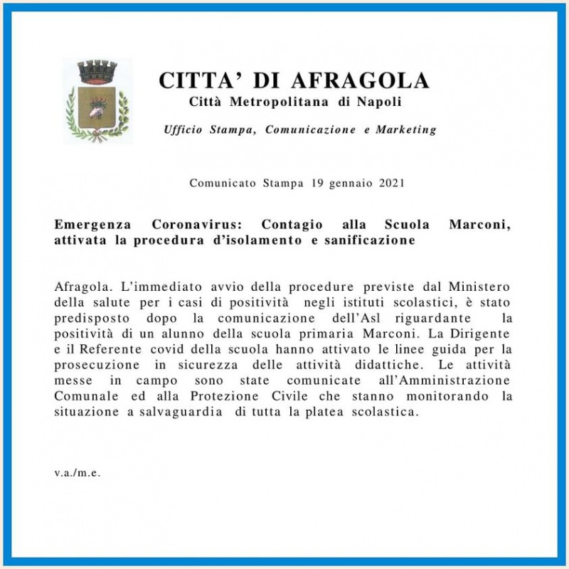 Pubblichiamo nota stampa del Comune di Afragola