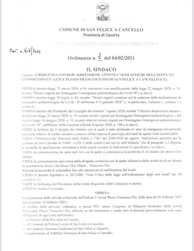 Con ordinanza a firma del Vicesindaco di S.Felice a Cancello, Orlando Savino, è stata disposta la chiusura per emergenza covid dell'Istituto Comprensivo F. Gesue plesso Francesco Pio dalla data di domani, 5 febbraio e sino al 10 febbraio 2021.