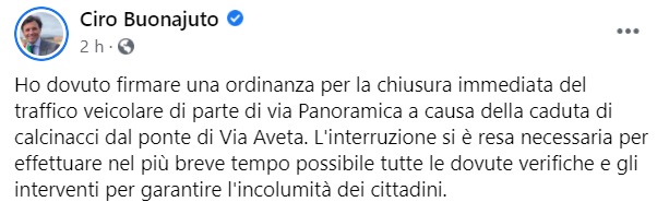 Questo quanto apprendiamo dalla pagina fb del Sindaco Buonajuto: "Ho dovuto firmare una ordinanza per la chiusura immediata del traffico veicolare di parte di via Panoramica a causa della caduta di calcinacci dal ponte di Via Aveta. L'interruzione si è resa necessaria per effettuare nel più breve tempo possibile tutte le dovute verifiche e gli interventi per garantire l'incolumità dei cittadini."