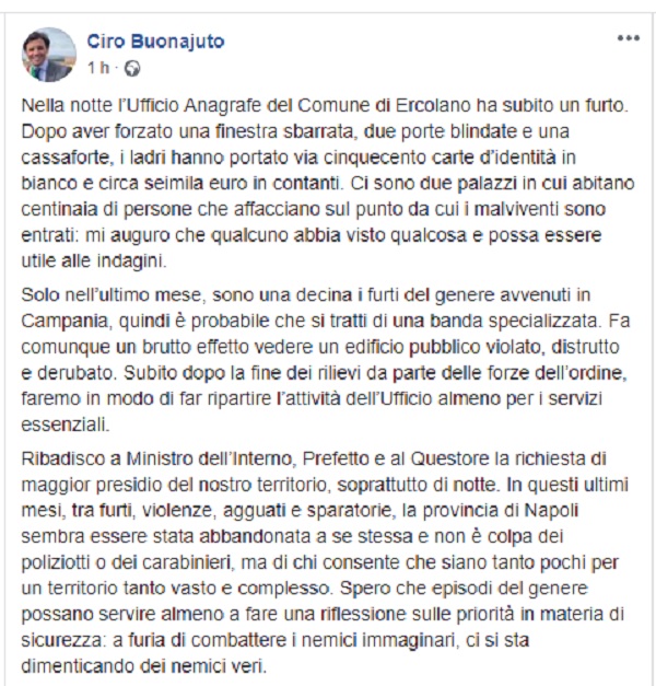 Questo il post pubblicato sulla pagina fb ufficiale del Sindaco di Ercolano Ciro Buonajuto.