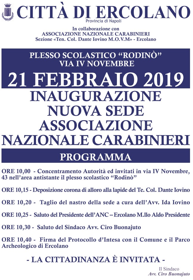 Riceviamo e pubblichiamo questa nota stampa: "Ercolano, giovedì l’inaugurazione della nuova sede dell’Associazione Nazionale Carabinieri. Si terrà giovedì 21 febbraio l’inaugurazione della nuova sede cittadina dell’Associazione Nazionale Carabinieri. Nei locali messi a disposizione dall’Amministrazione Comunale all’interno del plesso scolastico “Giulio Rodinò” di via IV Novembre, verrà allocata la sezione ercolanese dell’associazione che aggrega carabinieri in servizio, in congedo, i loro familiari e tutti i simpatizzanti dell’Arma. La cerimonia di inaugurazione - continua la nota - inizierà con un omaggio alla lapide che ricorda il Ten. Col. Dante Iovino. Alla presenza della Fanfara dell’Arma dei Carabinieri, il taglio del nastro dei nuovi locali dell’Associazione Nazionale Carabinieri sarà affidato ad Ida Iovino, discendente dell’Ufficiale ercolanese insignito della Medaglia d’Oro al Valore Militare. «L’individuazione di questa nuova sede è frutto di un lungo lavoro concordato con l’Associazione Nazionale Carabinieri e con i vertici dell’Arma – dice il sindaco di Ercolano Ciro Buonajuto -. Sono certo che la vicinanza tra l’Amministrazione Comunale e l’ANC porterà benefici alla nostra città e mi auguro che questa inaugurazione sia un buon viatico per la tanto attesa apertura della nuova Tenenza dell’Arma in corso Resina»."