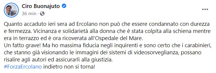 Questo quanto pubblicato sulla pagina fb del Sindaco Buonajuto: "Quanto accaduto ieri sera ad Ercolano non può che essere condannato con durezza e fermezza. Vicinanza e solidarietà alla donna che è stata colpita alla schiena mentre era in terrazzo - si legge nella nota - ed è ora ricoverata all'Ospedale del Mare. Un fatto grave! Ma ho massima fiducia negli inquirenti e sono certo che i carabinieri, che stanno già visionando le immagini dei sistemi di videosorveglianza, possano risalire agli autori ed assicurarli alla giustizia. Forza Ercolano indietro non si torna!"