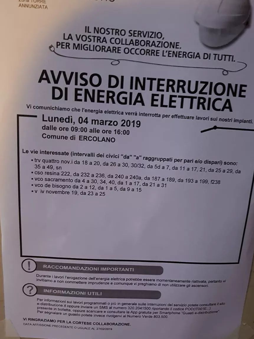 L'Enel ha segnalato che lunedì 4 marzo potrebbero esserci improvvise interruzioni dell'erogazione dell'energia elettrica a causa di lavori da effettuare in prossimità di una cabina di distribuzione. Le strade e i civici interessati sono quelli indicati nel manifesto. IMPORTANTE!!!