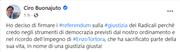 Questo il post pubblicato sulla pagina Facebook del sindaco di Ercolano, Ciro Buonajuto: "Ho deciso di firmare i referendum sulla giustizia dei Radicali perché credo negli strumenti di democrazia previsti dal nostro ordinamento e nel ricordo dell'impegno di Enzo Tortora, che ha sacrificato parte della sua vita, in nome di una giustizia giusta! - conclude".