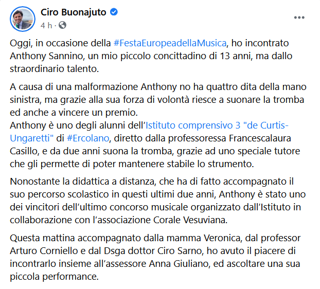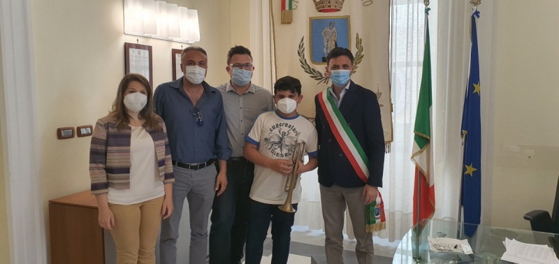 Questo il post pubblicato sulla pagina Facebook del Sindaco di Ercolano, Ciro Buonajuto: "Oggi, in occasione della Festa Europea della Musica, ho incontrato Anthony Sannino, un mio piccolo concittadino di 13 anni, ma dallo straordinario talento. A causa di una malformazione - si legge nel post - Anthony non ha quattro dita della mano sinistra, ma grazie alla sua forza di volontà riesce a suonare la tromba ed anche a vincere un premio. Anthony è uno degli alunni dell’Istituto comprensivo 3 "de Curtis-Ungaretti" di Ercolano, diretto dalla professoressa Francescalaura Casillo, e da due anni suona la tromba, grazie ad uno speciale tutore che gli permette di poter mantenere stabile lo strumento. Nonostante la didattica a distanza, che ha di fatto accompagnato il suo percorso scolastico in questi ultimi due anni, Anthony - prosegue il post - è stato uno dei vincitori dell’ultimo concorso musicale organizzato dall’Istituto in collaborazione con l’associazione Corale Vesuviana. Questa mattina - conclude il post - accompagnato dalla mamma Veronica, dal professor Arturo Corniello e dal Dsga dottor Ciro Sarno, ho avuto il piacere di incontrarlo insieme all’assessore Anna Giuliano, ed ascoltare una sua piccola performance".