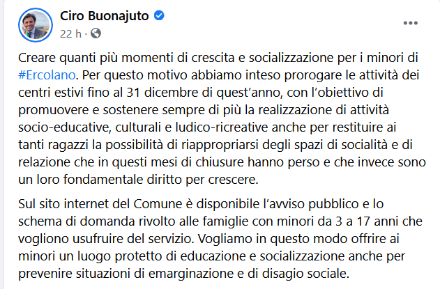 Questo il post pubblicato sulla pagina Facebook del sindaco di Ercolano, Ciro Buonajuto: "Creare quanti più momenti di crescita e socializzazione per i minori di Ercolano. Per questo motivo - si legge nel post - abbiamo inteso prorogare le attività dei centri estivi fino al 31 dicembre di quest’anno, con l’obiettivo di promuovere e sostenere sempre di più la realizzazione di attività socio-educative, culturali e ludico-ricreative anche per restituire ai tanti ragazzi la possibilità di riappropriarsi degli spazi di socialità e di relazione che in questi mesi di chiusure hanno perso e che invece sono un loro fondamentale diritto per crescere. Sul sito internet del Comune - si legge ancora - è disponibile l’avviso pubblico e lo schema di domanda rivolto alle famiglie con minori da 3 a 17 anni che vogliono usufruire del servizio. Vogliamo in questo modo - conclude - offrire ai minori un luogo protetto di educazione e socializzazione anche per prevenire situazioni di emarginazione e di disagio sociale".