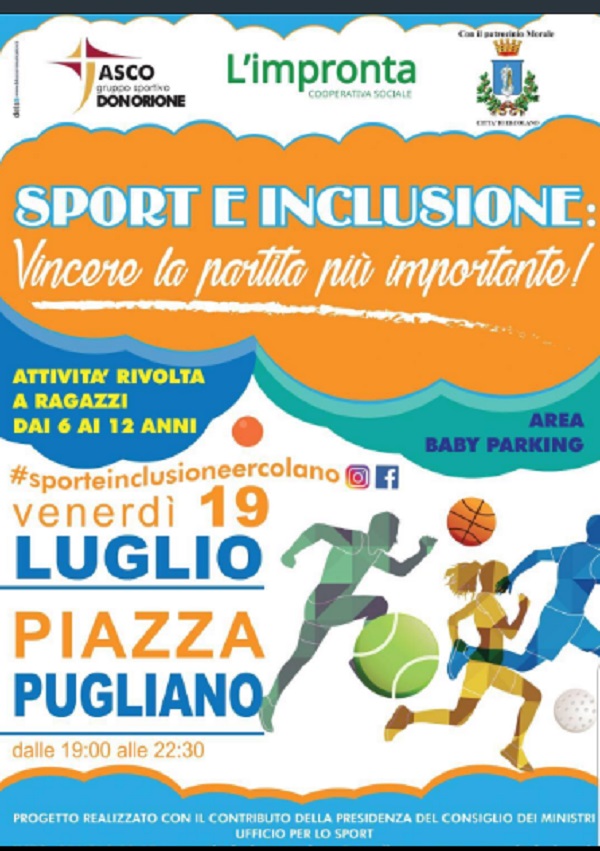 Si svolgerà di sera la seconda giornata di “Sport in città”, l’iniziativa realizzata nell’ambito del progetto “Sport e inclusione: vincere la partita più difficile” organizzata da Associazione Asco Don Orione e cooperativa L’Impronta con il patrocinio del Comune di Ercolano ed il finanziamento della Presidenza del Consiglio dei Ministri. Venerdì 19 luglio dalle ore 19 alle 22,30, Piazza Pugliano si trasformerà in una grande arena sportiva in cui bambini e ragazzi potranno cimentarsi insieme ad istruttori qualificati in attività di pallavolo, basket, atletica leggera, karate, bumberball e calciobalilla umano. Per i più piccoli è inoltre prevista un’area con animazione e giochi gonfiabili. Mentre bambini e ragazzi si divertiranno con sport e giochi, i più grandi potranno rivolgersi agli stand informativi che saranno allestiti in piazza con la presenza di medici sportivi, fisioterapisti e nutrizionisti."