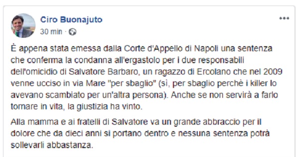 Questo il post pubblicato sulla pagina fb ufficiale del Sindaco di Ercolano Ciro Buonajuto.
