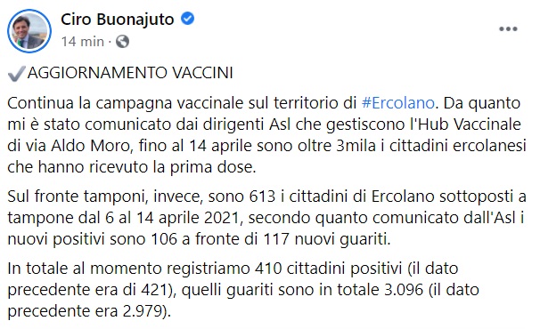 Questo quanto apprendiamo dalla pagina fb del Sindaco Buonajuto: "AGGIORNAMENTO VACCINI Continua la campagna vaccinale sul territorio di Ercolano. Da quanto mi è stato comunicato dai dirigenti Asl - si legge nella nota - che gestiscono l'Hub Vaccinale di via Aldo Moro, fino al 14 aprile sono oltre 3mila i cittadini ercolanesi che hanno ricevuto la prima dose. Sul fronte tamponi, invece, sono 613 i cittadini di Ercolano sottoposti a tampone dal 6 al 14 aprile 2021, secondo quanto comunicato dall'Asl i nuovi positivi sono 106 a fronte di 117 nuovi guariti. In totale al momento registriamo 410 cittadini positivi - si legge nella nota - (il dato precedente era di 421), quelli guariti sono in totale 3.096 (il dato precedente era 2.979)."