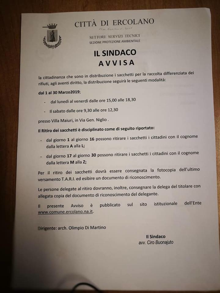 Questo l'avviso del Comune di Ercolano in merito al ritiro dei sacchetti per effettuare la raccolta differenziata.