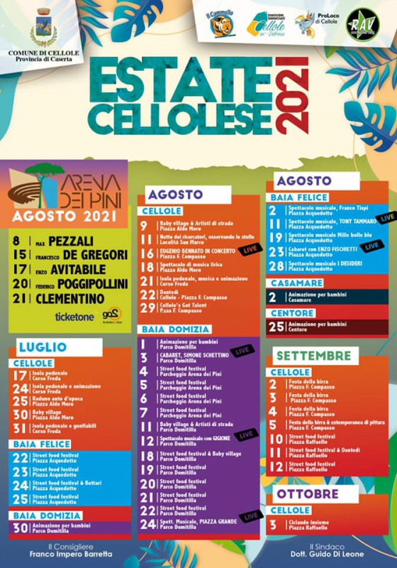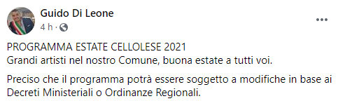 Questo il post pubblicato sulla sua pagina Facebook dal Sindaco di Cellole Guido Di Leone: "PROGRAMMA ESTATE CELLOLESE 2021