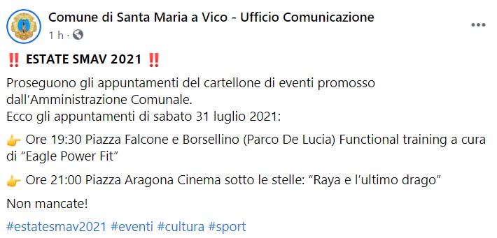 "ESTATE SMAV 2021!! Proseguono gli appuntamenti del cartellone di eventi promosso dall’Amministrazione Comunale. Ecco- si legge nella nota- gli appuntamenti di sabato 31 luglio 2021: Ore 19:30 Piazza Falcone e Borsellino (Parco De Lucia) Functional training a cura di “Eagle Power Fit”. Ore 21:00 Piazza Aragona Cinema sotto le stelle: “Raya e l’ultimo drago” Non mancate!"