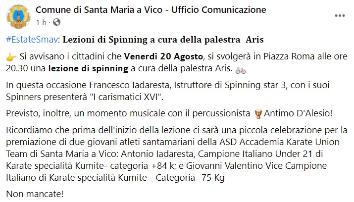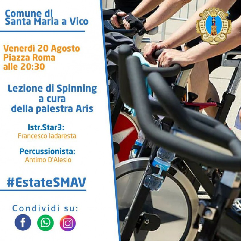 "#EstateSmav: Lezioni di Spinning a cura della palestra Aris. Si avvisano i cittadini che Venerdì 20 Agosto, si svolgerà in Piazza Roma alle ore 20.30 una lezione di spinning a cura della palestra Aris. In questa occasione- si legge nella nota- Francesco Iadaresta, Istruttore di Spinning star 3, con i suoi Spinners presenterà "I carismatici XVI". Previsto, inoltre, un momento musicale con il percussionista Antimo D'Alesio! Ricordiamo che prima dell'inizio della lezione ci sarà una piccola celebrazione per la premiazione di due giovani atleti santamariani della ASD Accademia Karate Union Team di Santa Maria a Vico: Antonio Iadaresta, Campione Italiano Under 21 di Karate specialità Kumite- categoria +84 k; e- si legge nella nota- Giovanni Valentino Vice Campione Italiano di Karate specialità Kumite - Categoria -75 Kg. Non mancate!"