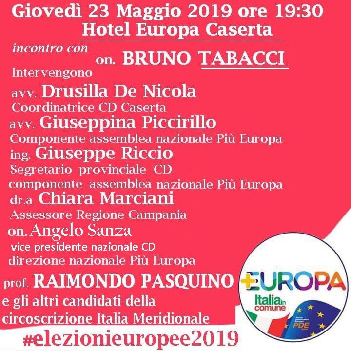 Giovedì 23 maggio alle ore 19:30 appuntamento elettorale all'Hotel Europa di Caserta per la lista Più Europa. Interverrà l'on. Bruno Tabacci, il candidato alle elezioni europee Raimondo Pasquino, diversi esponenti del partito e tutti gli altri candidati della circoscrizione Italia Meridionale.
