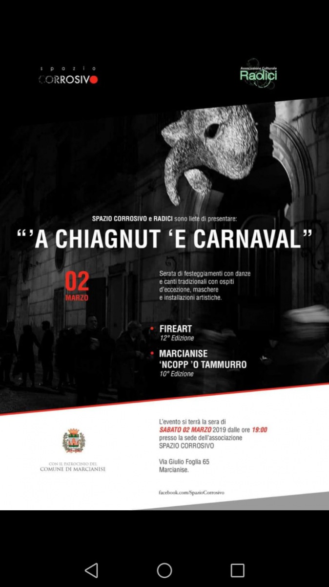 "Le associazioni Spazio Corrosivo e Radici, con il patrocinio del comune di Marcianise, vi aspettano sabato 2 marzo in una sola grande festa “‘a chiagnut ‘e Carnaval”, nata dal gemellaggio di FireArt 12 e Marcianise ‘ncopp ‘o tammurro 10
