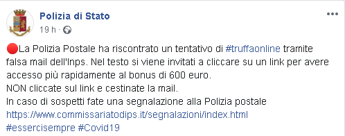 "La Polizia Postale ha riscontrato un tentativo di truffa online tramite falsa mail dell'Inps. Nel testo si viene invitati a cliccare su un link per avere accesso più rapidamente al bonus di 600 euro. NON cliccate sul link e cestinate la mail. In caso di sospetti fate una segnalazione alla Polizia postale"