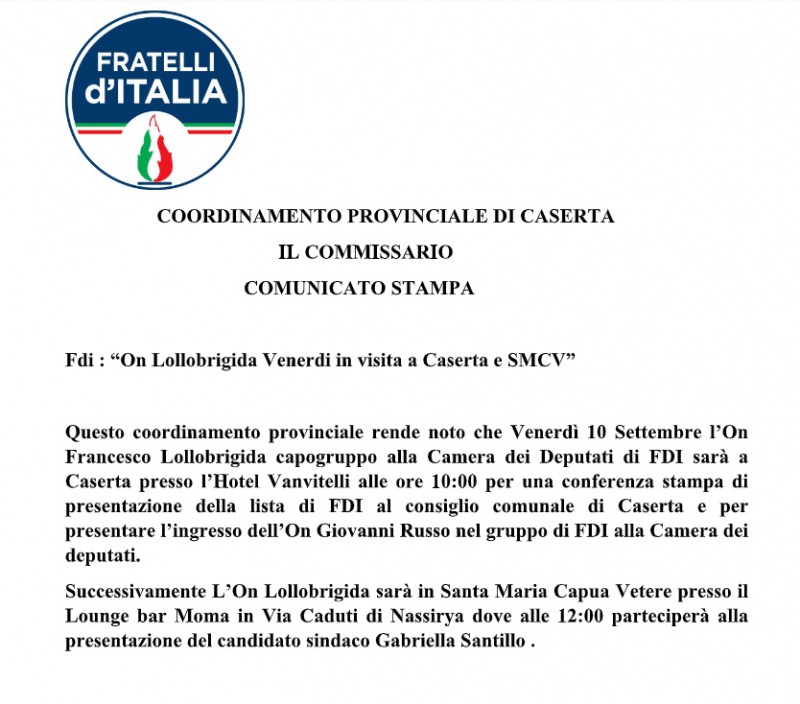 "Fdi: “On Lollobrigida Venerdi in visita a Caserta e SMCV”. Questo coordinamento provinciale rende noto che Venerdì 10 Settembre l’On Francesco Lollobrigida capogruppo alla Camera dei Deputati di FDI sarà a Caserta- si legge nella nota- presso l’Hotel Vanvitelli alle ore 10:00 per una conferenza stampa di presentazione della lista di FDI al consiglio comunale di Caserta e per presentare l’ingresso dell’On Giovanni Russo nel gruppo di FDI alla Camera dei deputati. Successivamente L’On Lollobrigida sarà in Santa Maria Capua Vetere presso il Lounge bar Moma in Via Caduti di Nassirya dove- si legge nella nota- alle 12:00 parteciperà alla presentazione del candidato sindaco Gabriella Santillo."
