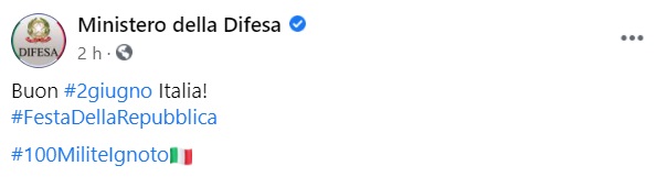 Questo quanto apprendiamo dalla pagina fb del Ministero della Difesa: "Buon 2 giugno Italia! Festa Della Repubblica 100 Milite Ignoto"