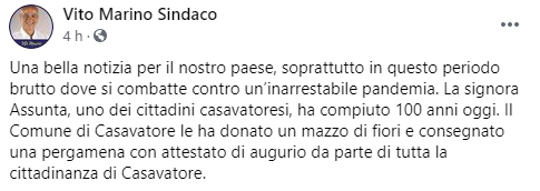 Questo il post pubblicato sulla sua pagina Facebook dal Sindaco di Casavatore Vito Marino: "Una bella notizia per il nostro paese, soprattutto in questo periodo brutto dove si combatte contro un’inarrestabile pandemia. La signora Assunta, uno dei cittadini casavatoresi, ha compiuto 100 anni oggi. Il Comune di Casavatore - si legge nel post - le ha donato un mazzo di fiori e consegnato una pergamena con attestato di augurio da parte di tutta la cittadinanza di Casavatore".
