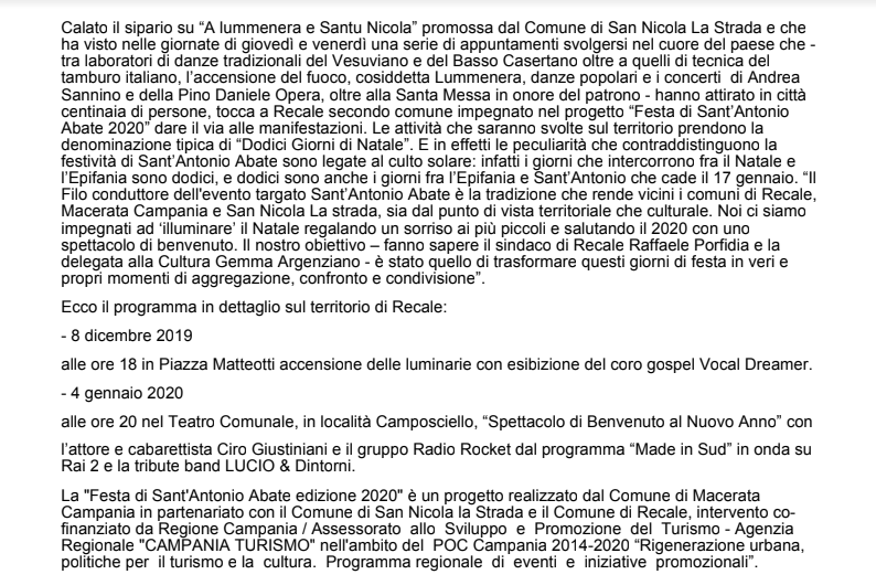 Di seguito, il testo del comunicato su Festa Sant'Antonio Abate 2020, giunto in redazione.