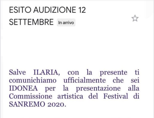 Questo quanto espresso sui social dalla giovane Ilaria Maglione: "Sono felice di condividere con voi un’emozione grande: Ancora una volta ho deciso di mettermi in gioco e presa dalle emozioni ho espresso tutto ciò che ho dentro. Ho cantato una delle mie canzoni preferite, una canzone che sento mia, ricca di significato che mi ha portato ad esprimere tutta me stessa su quel palco. La grande notizia è che sono tra i candidati al festival di Sanremo Giovani e quindi dovrò esibirmi davanti alla commissione Rai, sperando di realizzare un sogno: il grande Festival. Il mio grazie va alla musica, che mi permette di essere ciò che sono realmente. Un grazie va anche a me stessa perché non smetto mai di crederci e vado avanti, verso il mio obiettivo."