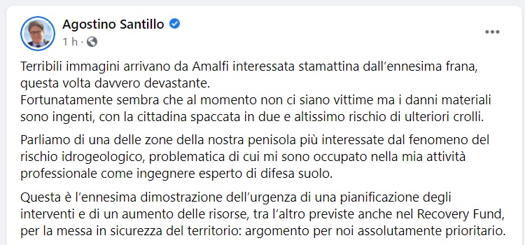 Questo quanto apprendiamo dalla apgina fb del Sen. Santillo: "Terribili immagini arrivano da Amalfi interessata stamattina dall’ennesima frana - si legge nella nota -, questa volta davvero devastante. Fortunatamente sembra che al momento non ci siano vittime ma i danni materiali sono ingenti, con la cittadina spaccata in due e altissimo rischio di ulteriori crolli. Parliamo di una delle zone della nostra penisola più interessate dal fenomeno del rischio idrogeologico, problematica di cui mi sono occupato nella mia attività professionale come ingegnere esperto di difesa suolo. Questa è l’ennesima dimostrazione dell’urgenza - si legge nella nota - di una pianificazione degli interventi e di un aumento delle risorse, tra l’altro previste anche nel Recovery Fund, per la messa in sicurezza del territorio: argomento per noi assolutamente prioritario."